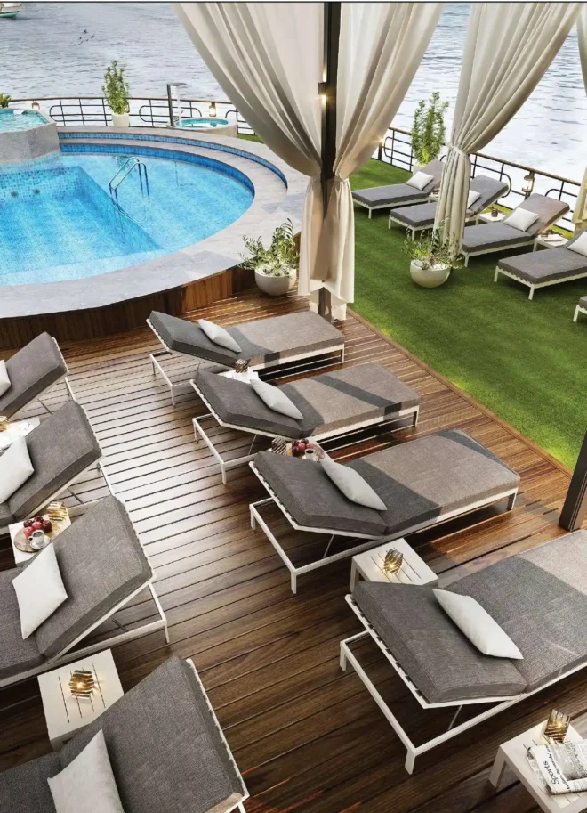 The Liberty Nile Cruise offers a refined five-star experience along the Nile. Its elegant champagne exterior and contemporary interiors reflect a modern interpretation of Egyptian craftsmanship. With thoughtful design, attentive service, and smart in-room technology powered by Alexa, The Liberty invites guests to experience comfort, style, and the quiet beauty of the river in perfect harmony.